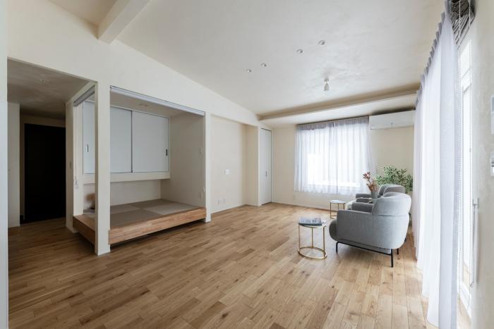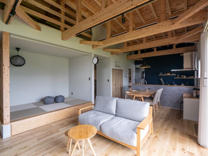 ここからは、竹内建設が施工した住宅の事例から、小上がり和室のあるリビングを紹介します。どれも後悔しない6つのポイントを踏まえており、リビングインテリアと調和するデザインです。ぜひ参考にしてくださいね。