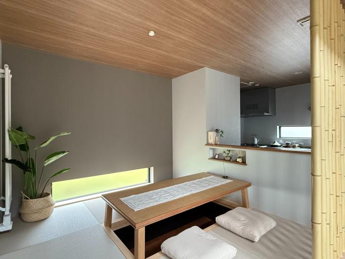 段差を活かし、掘りごたつに腰掛けられるテーブルをつくった実例です。キッチンの正面に配置し、ダイニングとして使える小上がり和室を実現しました。