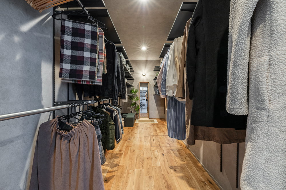 ファッションが好きなお施主様ご夫婦。セレクトショップのようなクローゼットにお気に入りの服をディスプレイしています。ランドリールームと隣接させて、家事動線の効率もアップしました。