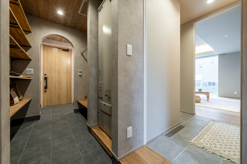 札幌市内に建つこちらの家は、玄関から洗面室を通ってリビングに向かう「おかえり導線」を採用しました。玄関ドアを開けると広々としたエントランスが設けられています。