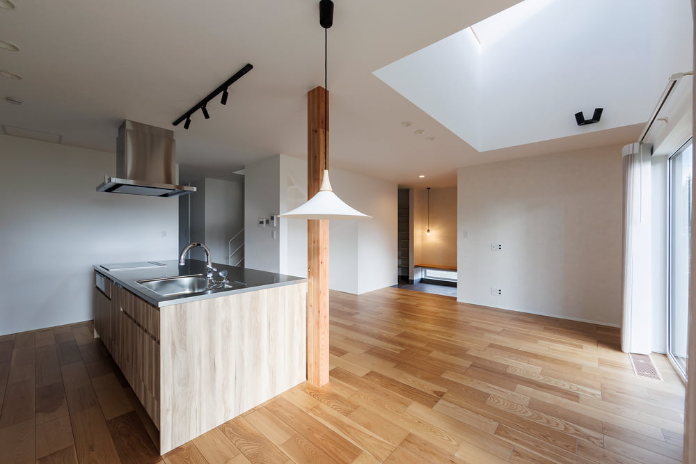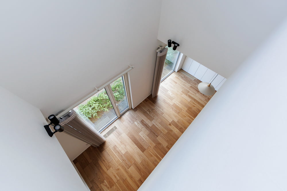 リビングに設けた吹き抜けが、1階と2階をひとつの空間につないでくれる住まいです。