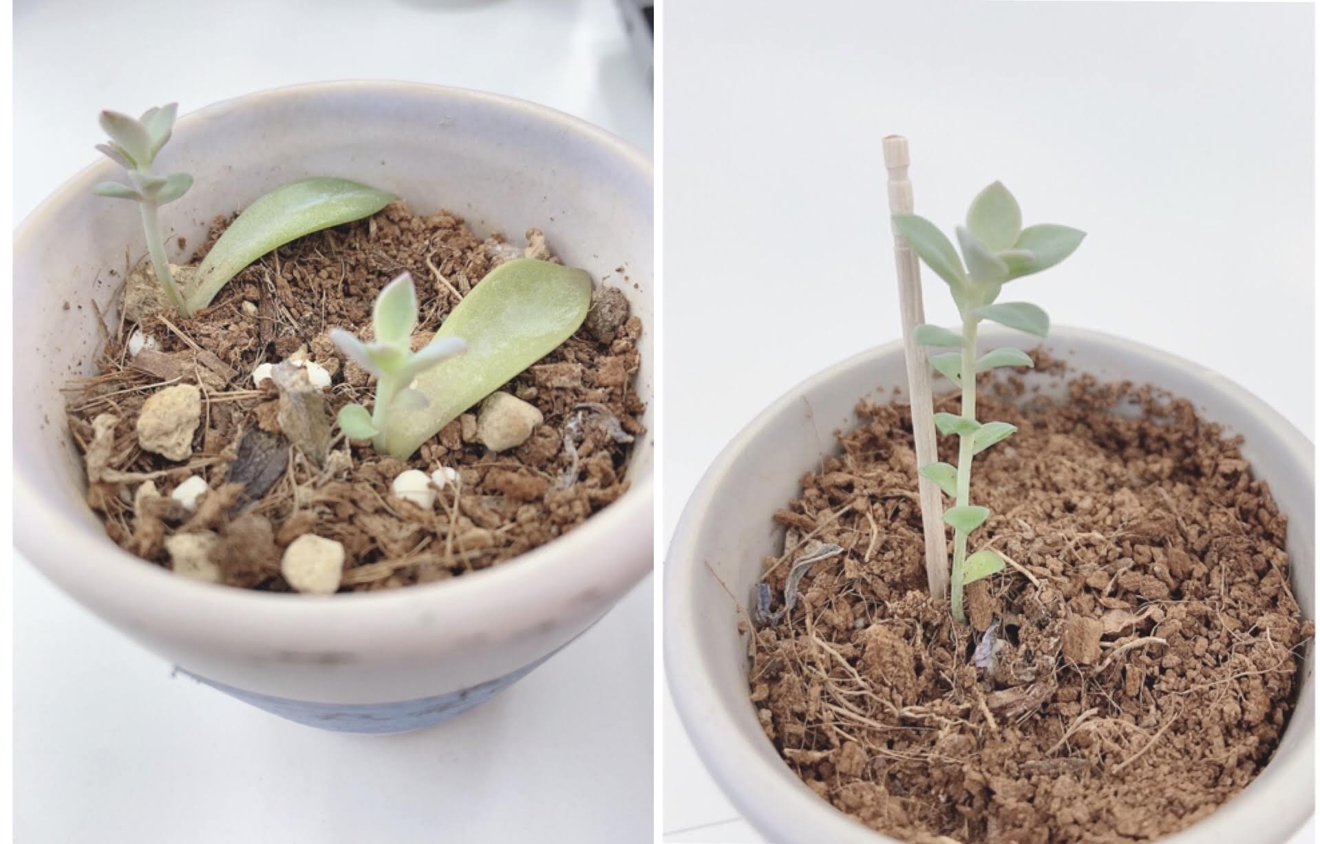 左側はかなり違いがわかります!ほんとに葉っぱを埋めるだけでまた芽が出てくるなんてびっくりです!!