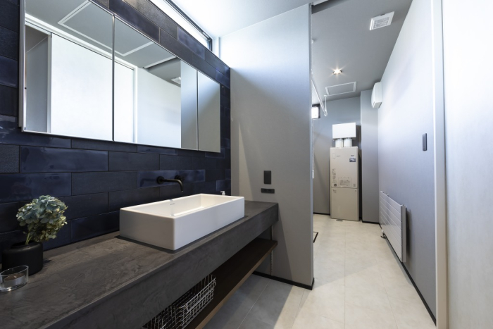 ユーティリティはキッチンの背面に位置し、効率的な家事動線に。存在感のある造作洗面台には高い強度と防水性を誇るモールテックスを採用。3種類のタイルを張り分け、質感の高い仕上がりに。
