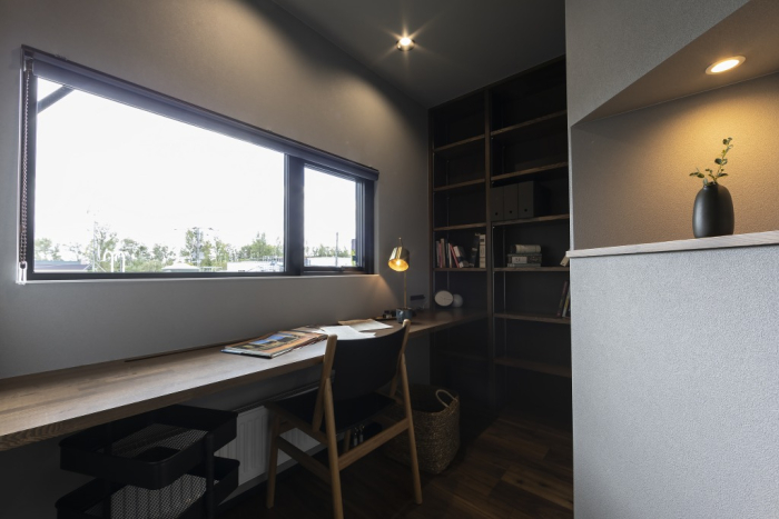 2階の通路奥には書斎と造作本棚。家族とゆるくつながりながらも、仕事や読書、趣味などを落ち着いて行える空間です。