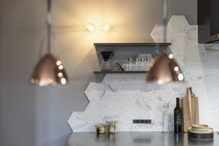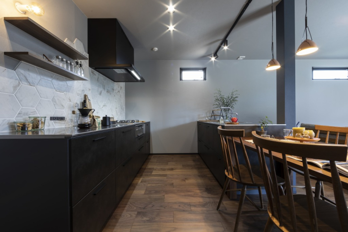 キッチンとダイニングは直線に並び、背面には意匠性の高いタイルをアシンメトリーに配置。不要なモノがない、どこから見ても美しいミニマルな家事空間となっています。