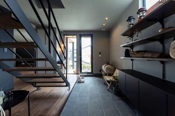 玄関ドアを開けると縁側まで抜ける大きな土間。お気に入りのギアを並べたり、メンテナンスしたり、冬でも気軽にDIYをしたり。縁側へとシームレスにつながり、さらには庭を挟んでLDKと一体になったかのような開放的な空間が広がります。