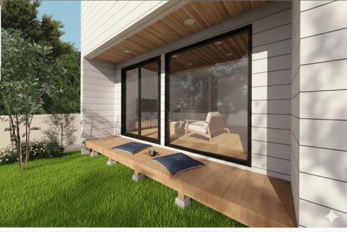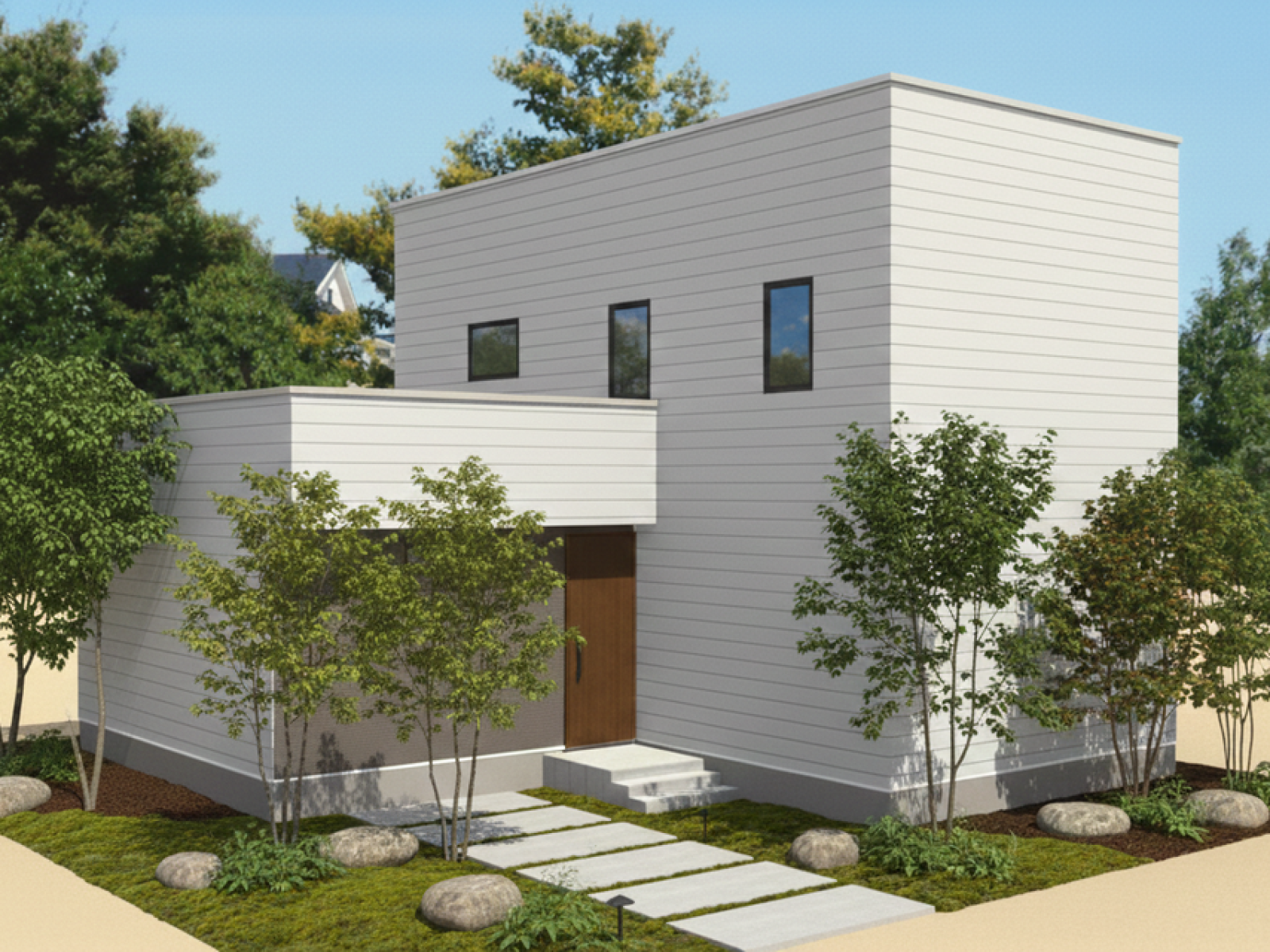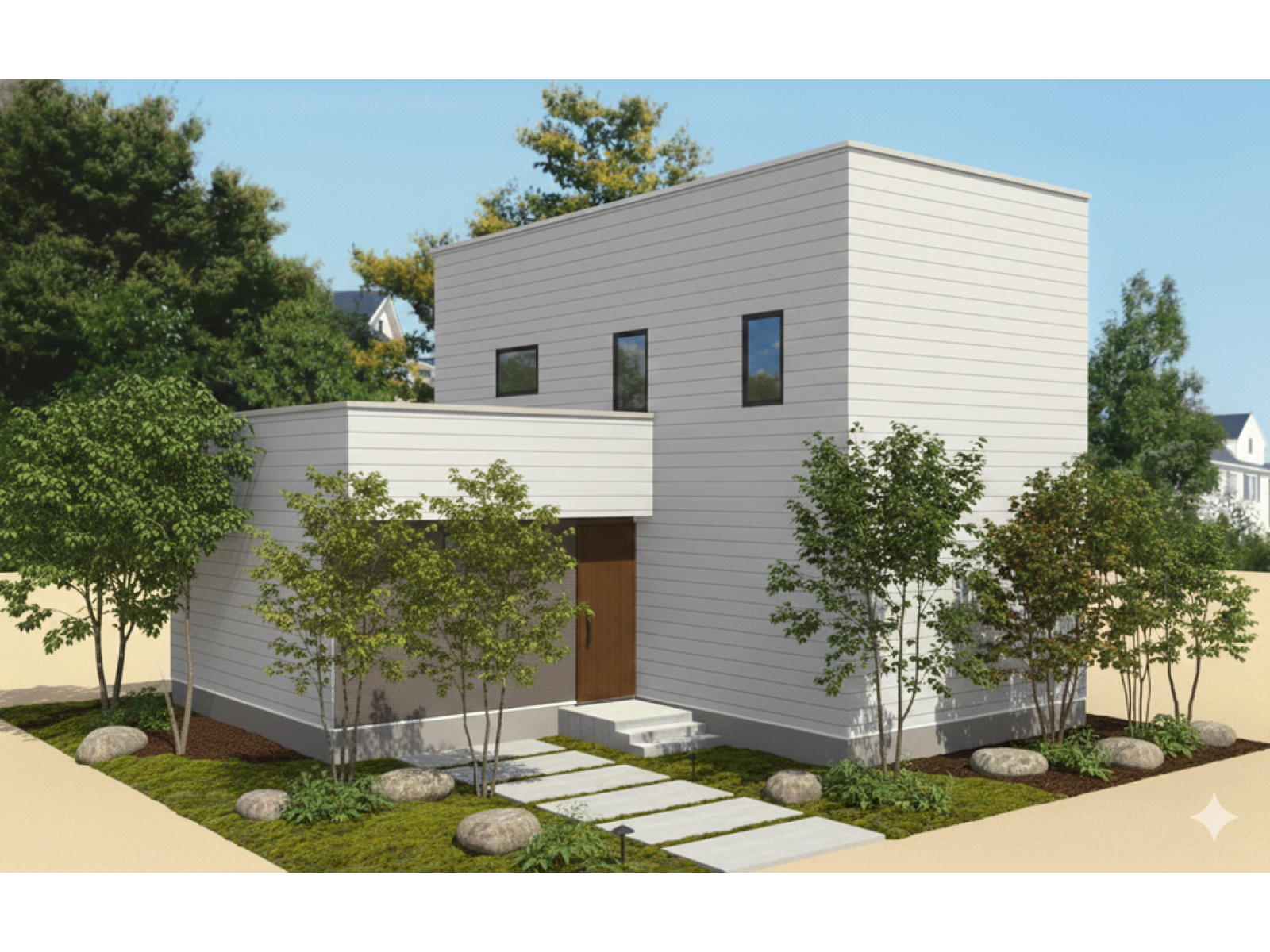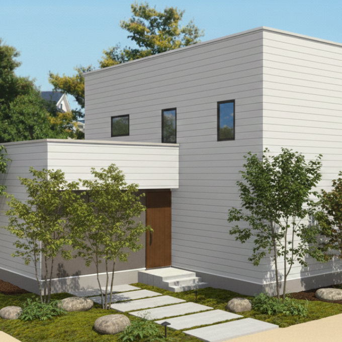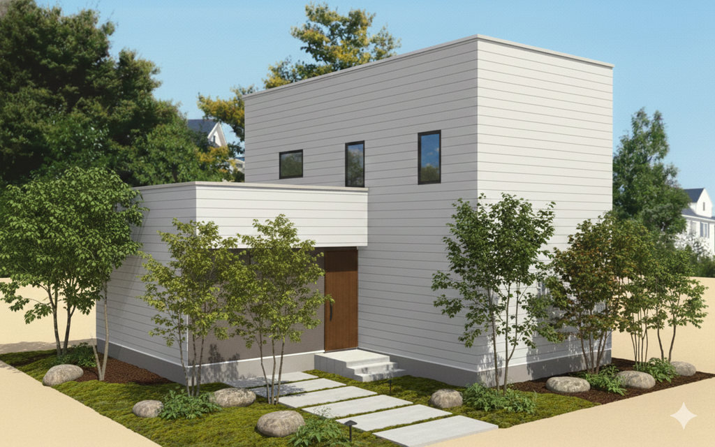 - シンプルな外観と木をあしらった温かみのあるファサード。