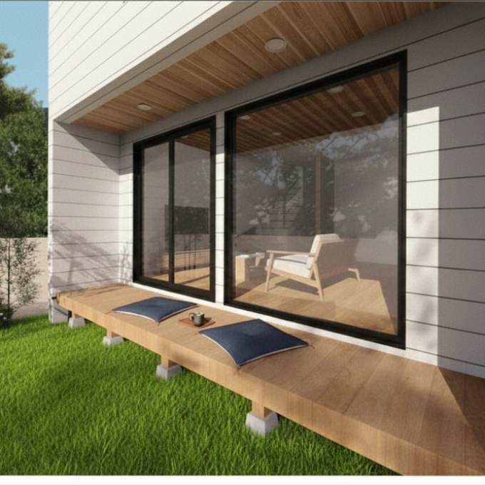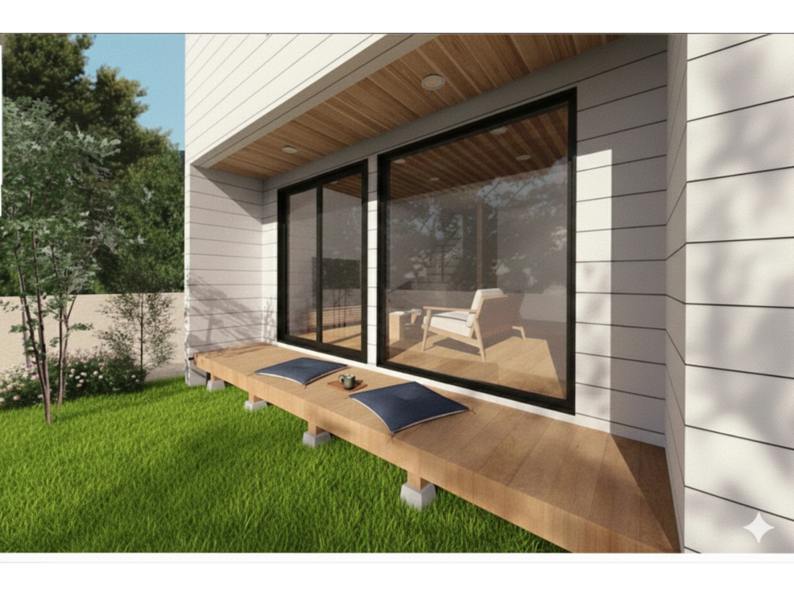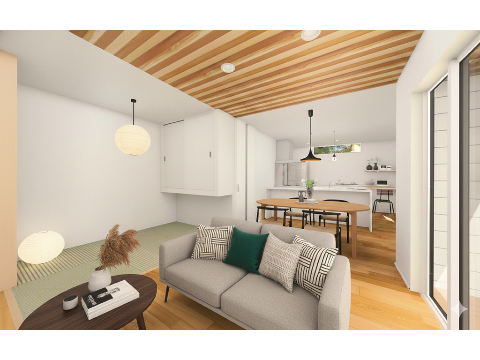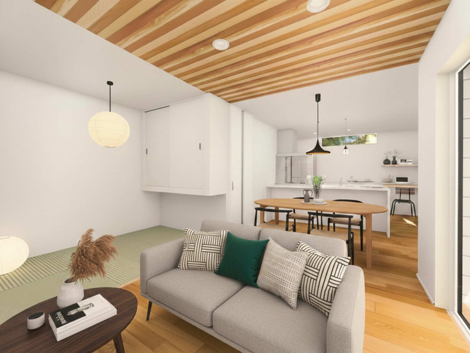 随所に天然木をあしらった贅沢な空間。大きな窓から広がる緑の景色、時間帯によって変わる光の入り方。 郊外という立地を最大限に活かし、外と内がゆるやかにつながる設計を実現しました。 朝はやわらかな光で一日が始まり、夕方は落ち着いた陰影が空間を包みます。