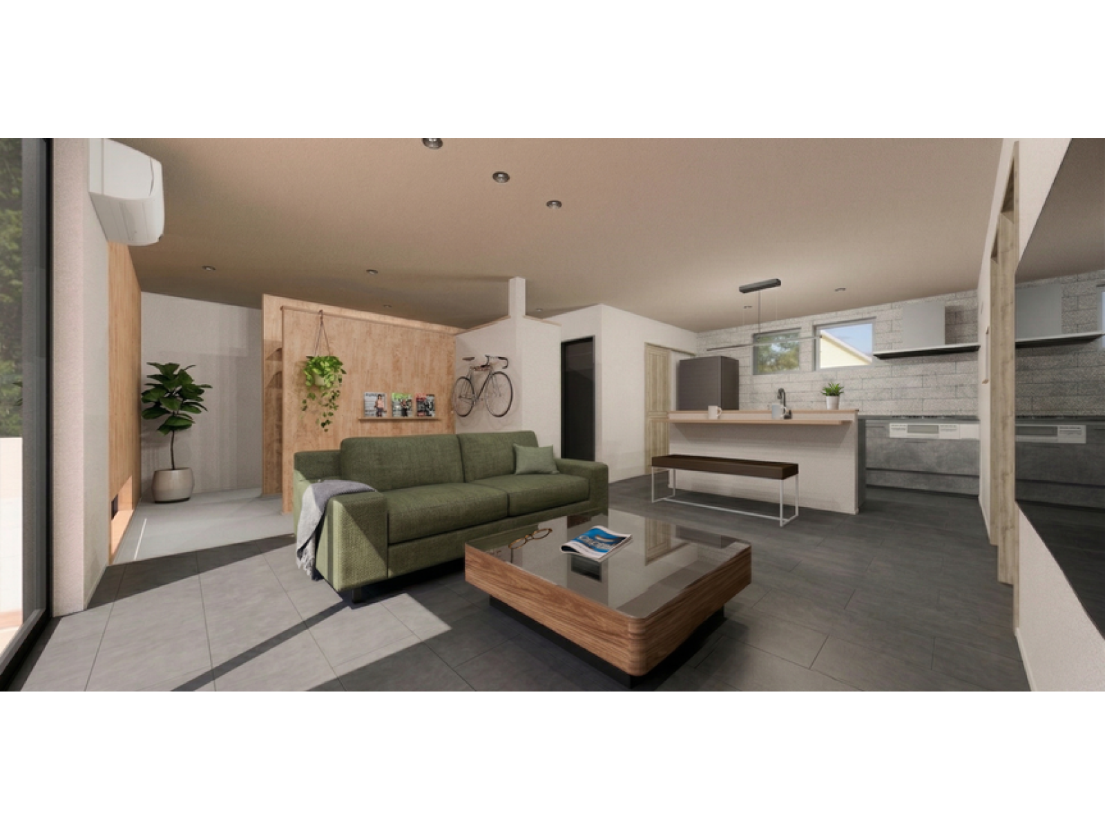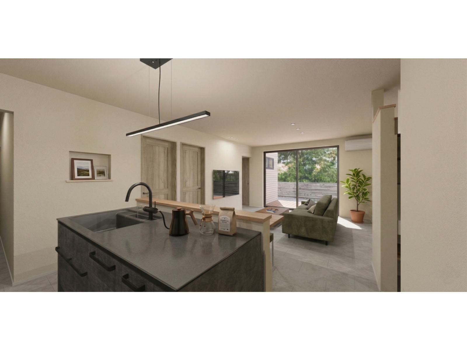LDKにはダイニングセットを置かず、キッチンに備え付けたカウンターで食事をとるスタイルに。