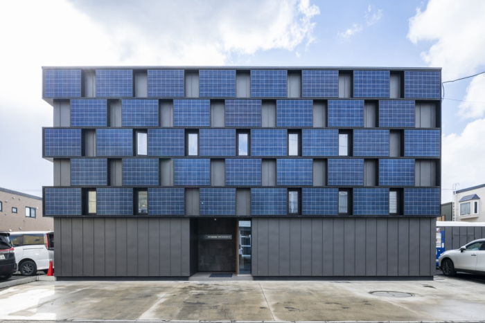 完成した新社屋 市松模様に外壁に貼られているのが太陽光パネル
