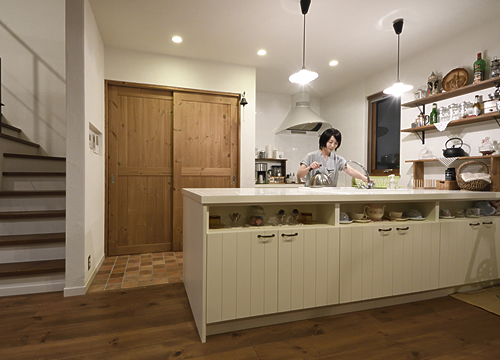 キッチンカウンターは奥様の身長に合わせたオーダーメイド。「収納力も豊富で食器もスッキリと納まります。また冷蔵庫も見えないよう部屋の雰囲気に合わせ扉をつけました。設計士さんが女性ならではの目線で色々な提案をしてくださいました」と奥様。