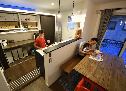 構造躯体をいかしたリノベーションで希望を叶えた、二世帯住宅のO様邸。家を検討した時に、趣味の道具が多すぎてマンションでは収まりきらないだろうと判断し、一軒家を考えたと言います。「子供の学校のことなども考え、エリアを絞って探していました」とO様。「竹内建設さんのことは住宅雑誌を見て知りました。近くだし、ちょっと行ってみようか、と営業時間ぎりぎりのところに飛び込んだのにもかかわらず、嫌な顔をされることなく、丁寧な対応で好印象でした」と奥様。住宅展示場も数カ所見て周り、各社に土地情報の依頼をしていたものの、希望する土地は見つからなかったそう。そんな時、担当の菅野さんから築35年の家が建つ、この場所を案内されたと言います。O様ご夫妻は「近くに仲の良いお友達がいる所で、まさに出会いだと思いました」と笑います。