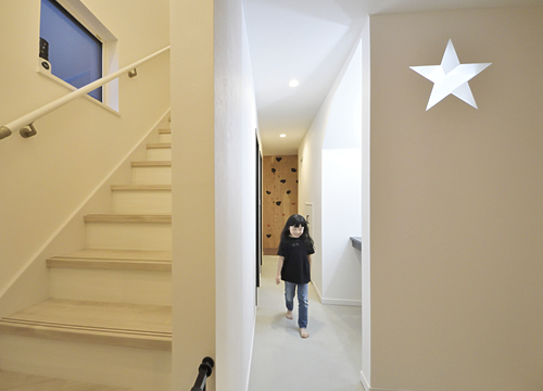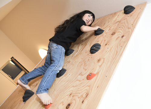 玄関から延びる土間、その先にカラフルなホールドが目を惹くボルダリングウォール。スタンドアップパドルサーフィン(SUP)やスキーなど、趣味の道具が収まる豊富な収納。O様邸はアウトドア好きにはたまらない住まいです。「ハングのある大きなウォールは妻に却下されましたが...」と笑うO様。「土間をしつらえたおかげで自分の身体が多少濡れていたり、汚れていても気にせずそのままバスルームまで行けます」と、その使い勝手の良さに太鼓判を押します。
