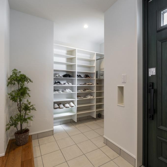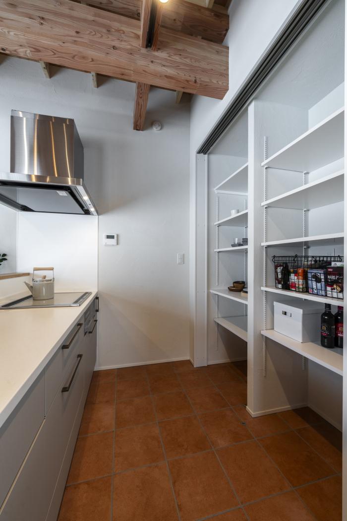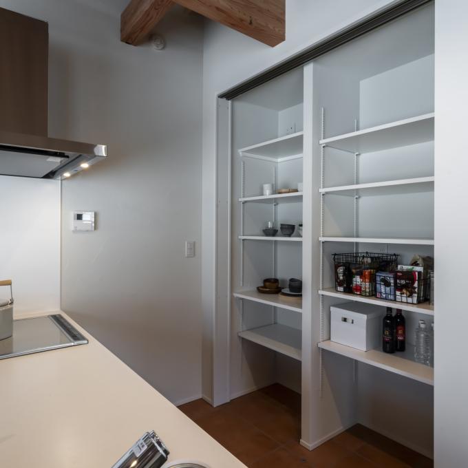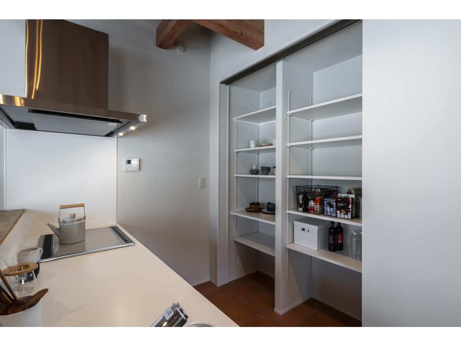 キッチンの背面収納には食器も食材のストックもたくさん仕舞える大容量タイプを採用。