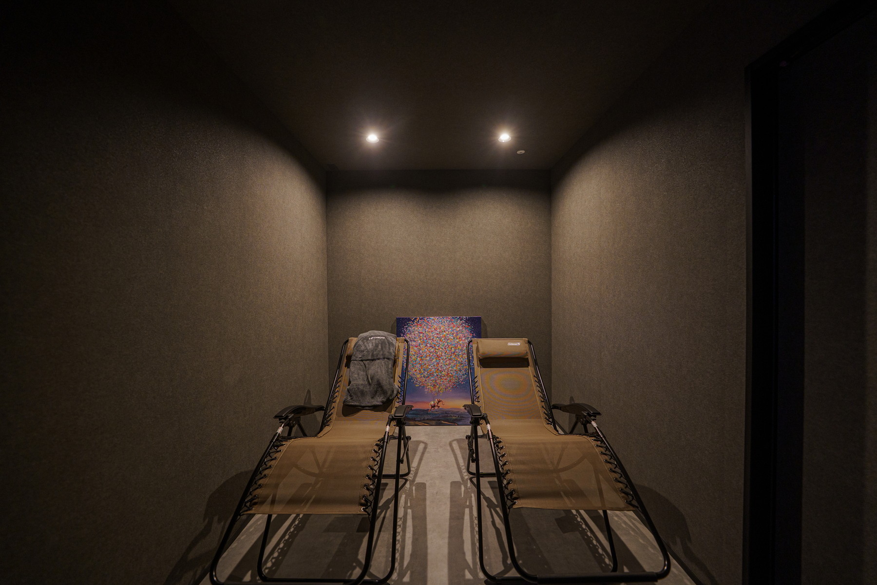 サウナ後にすぐ移動できる動線で、イスやリクライニングを置いても余裕の広さで、