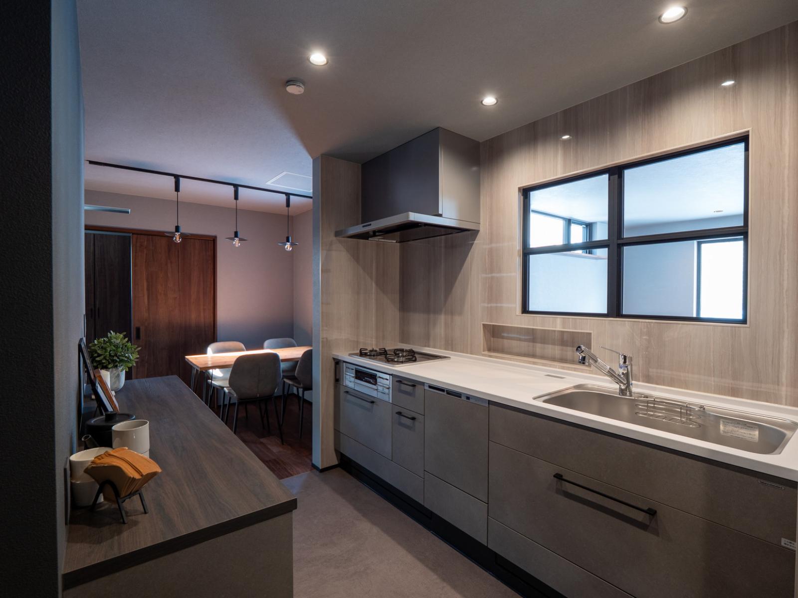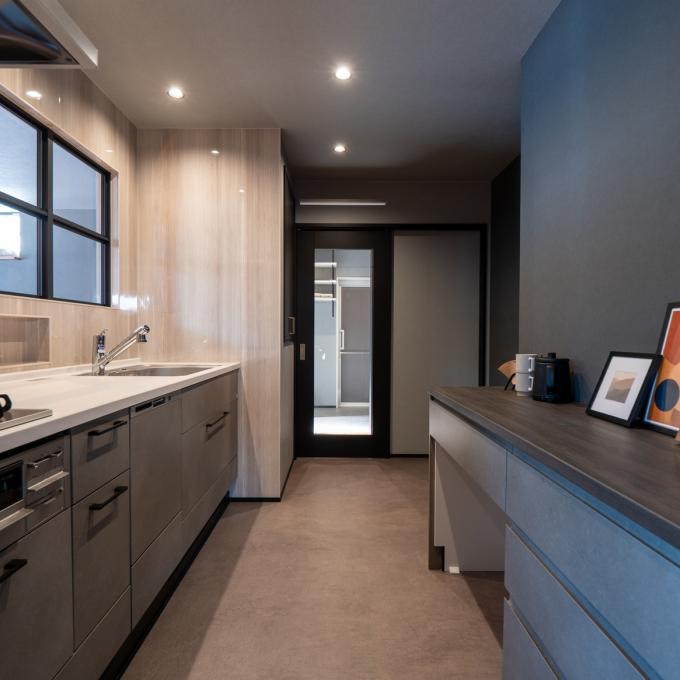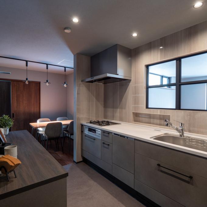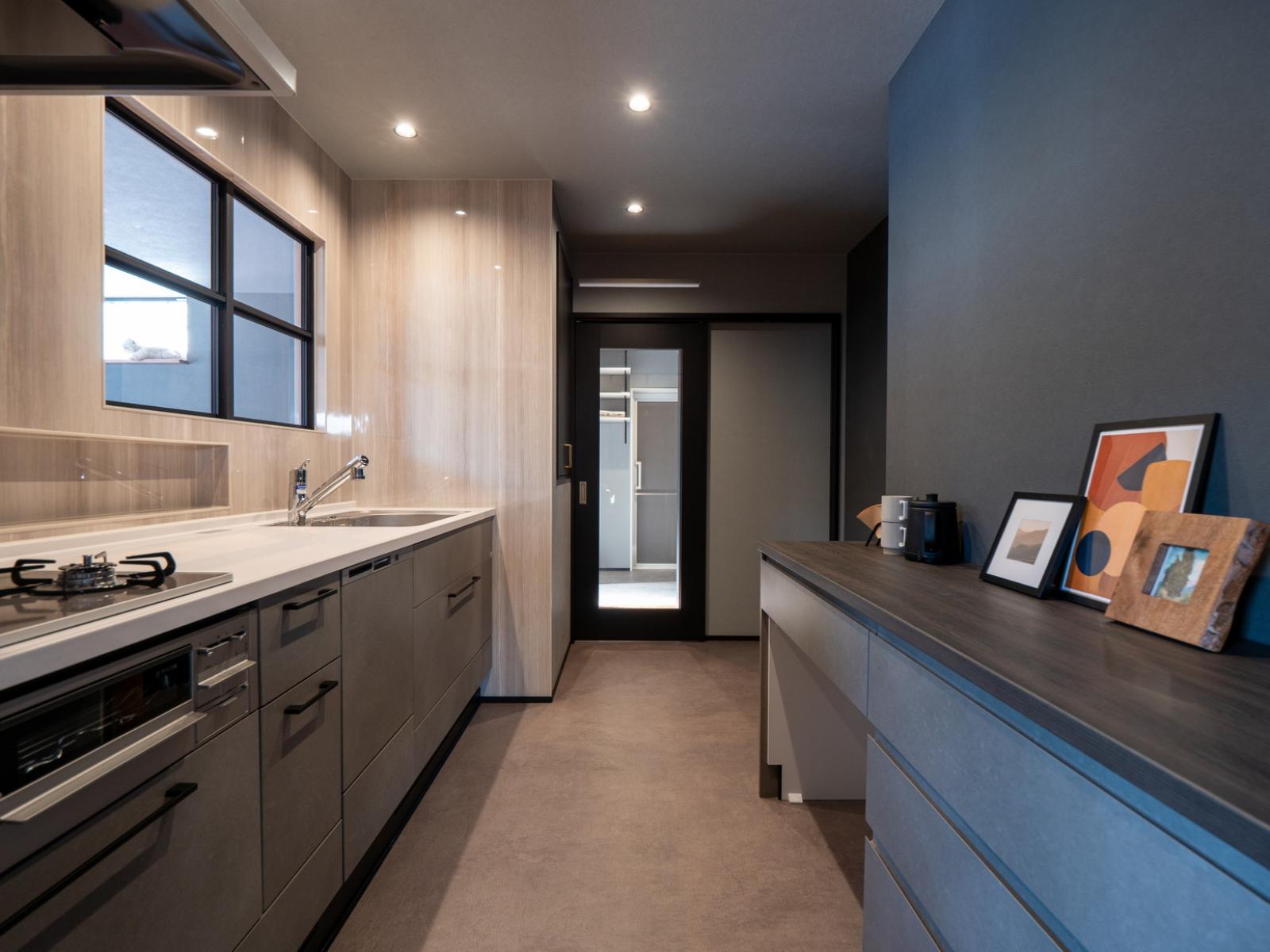 キッチンは、猫ちゃんが誤って入らないよう動線と間仕切りを工夫した安心設計。