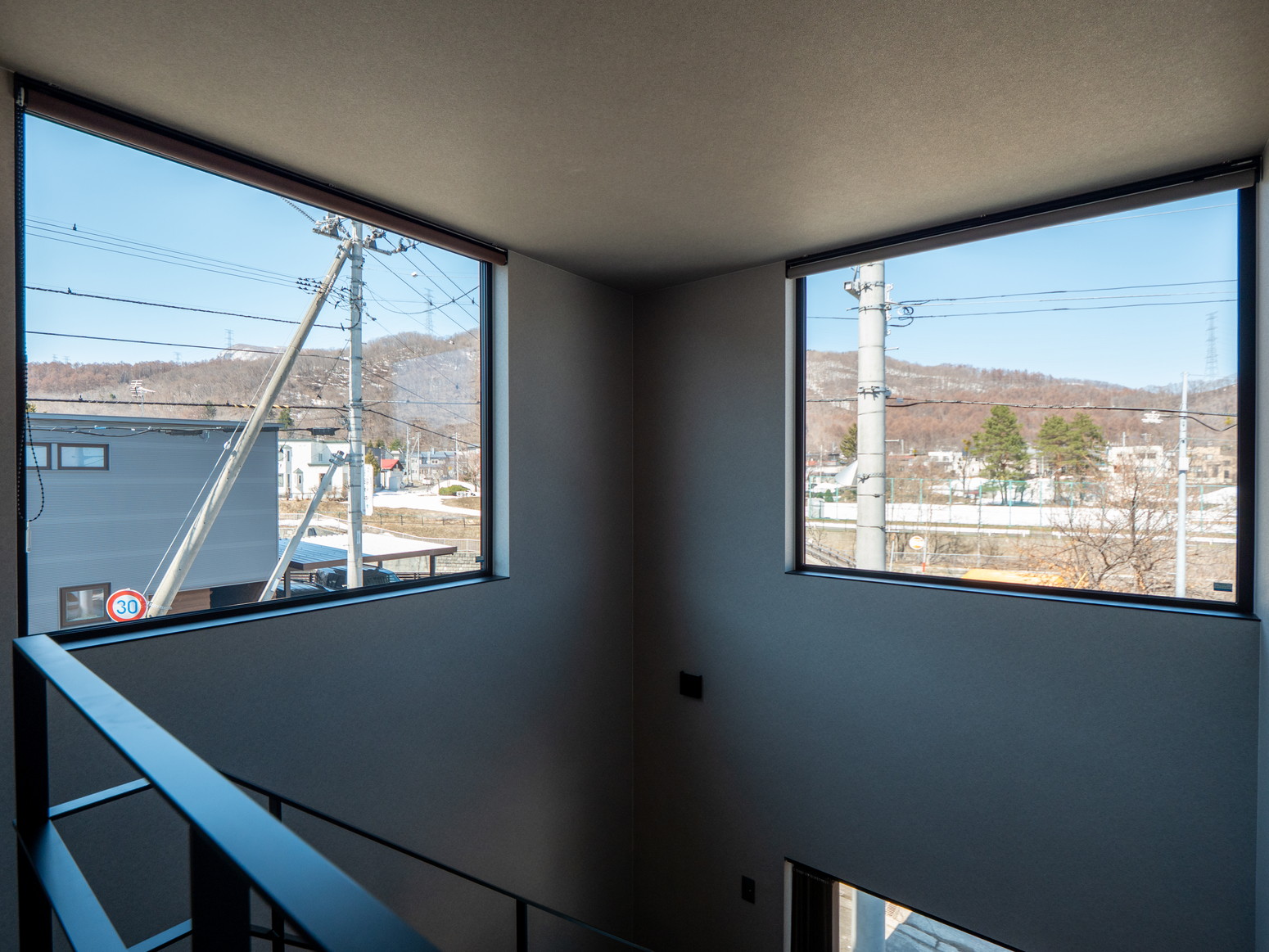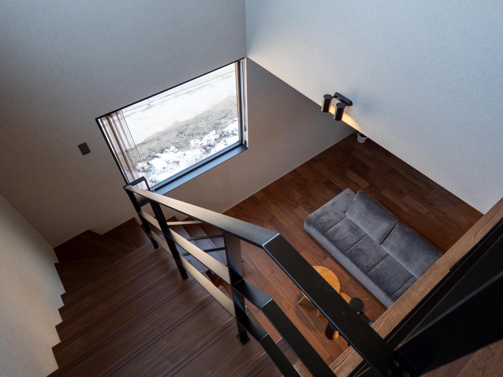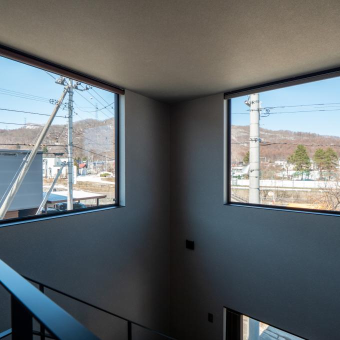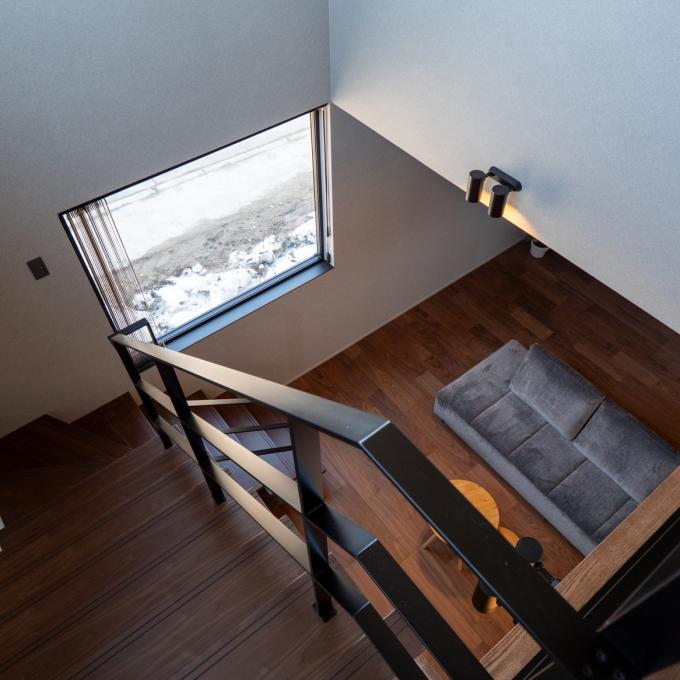 リビングから吹き抜けを見上げると、縦に広がる窓からの景色がとても開放的。