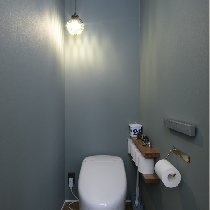 すっきりとした印象の土間玄関をあがるとひときわ目を引くのがモールテックス素材の造作洗面台。スタイリッシュな印象の中に真鍮のペンダントライトやタオルバーが柔らかく上品な印象で調和しています。