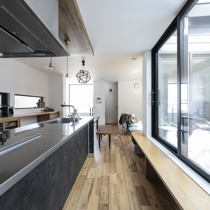 2階は南側のインナーテラスをL字型に囲む明るいリビングダイニング。トップ・シンクをステンレスで統一し、主役級のダイニングキッチンとなりました。
