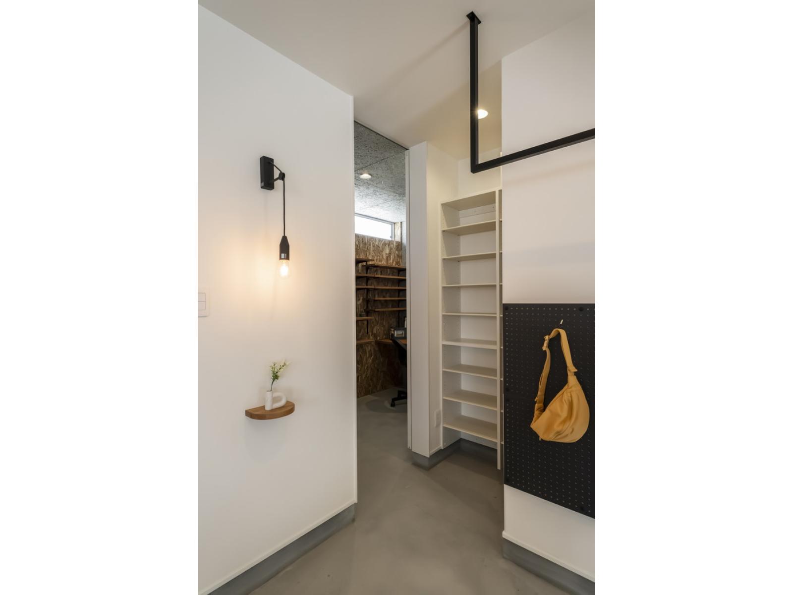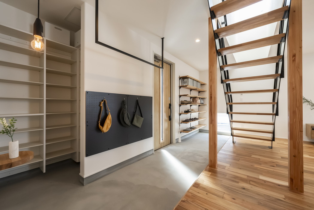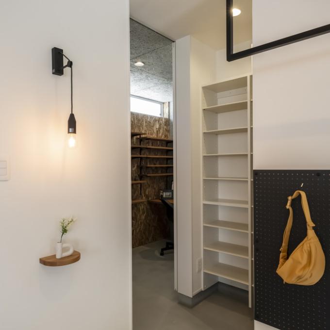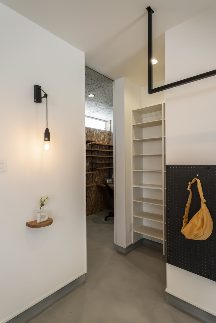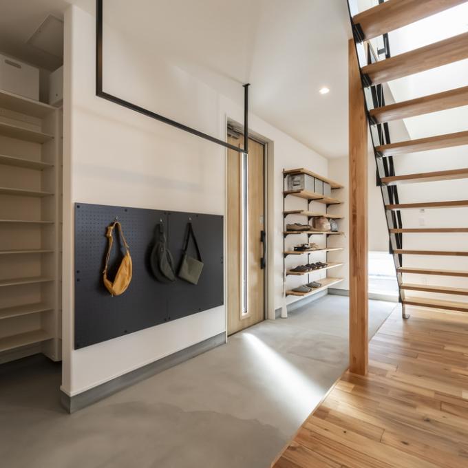 ライフステージによって変わる持ち物の量に対応するために、各所にざっくりとした収納スペースを用意。玄関には土間に沿ったオープン棚。