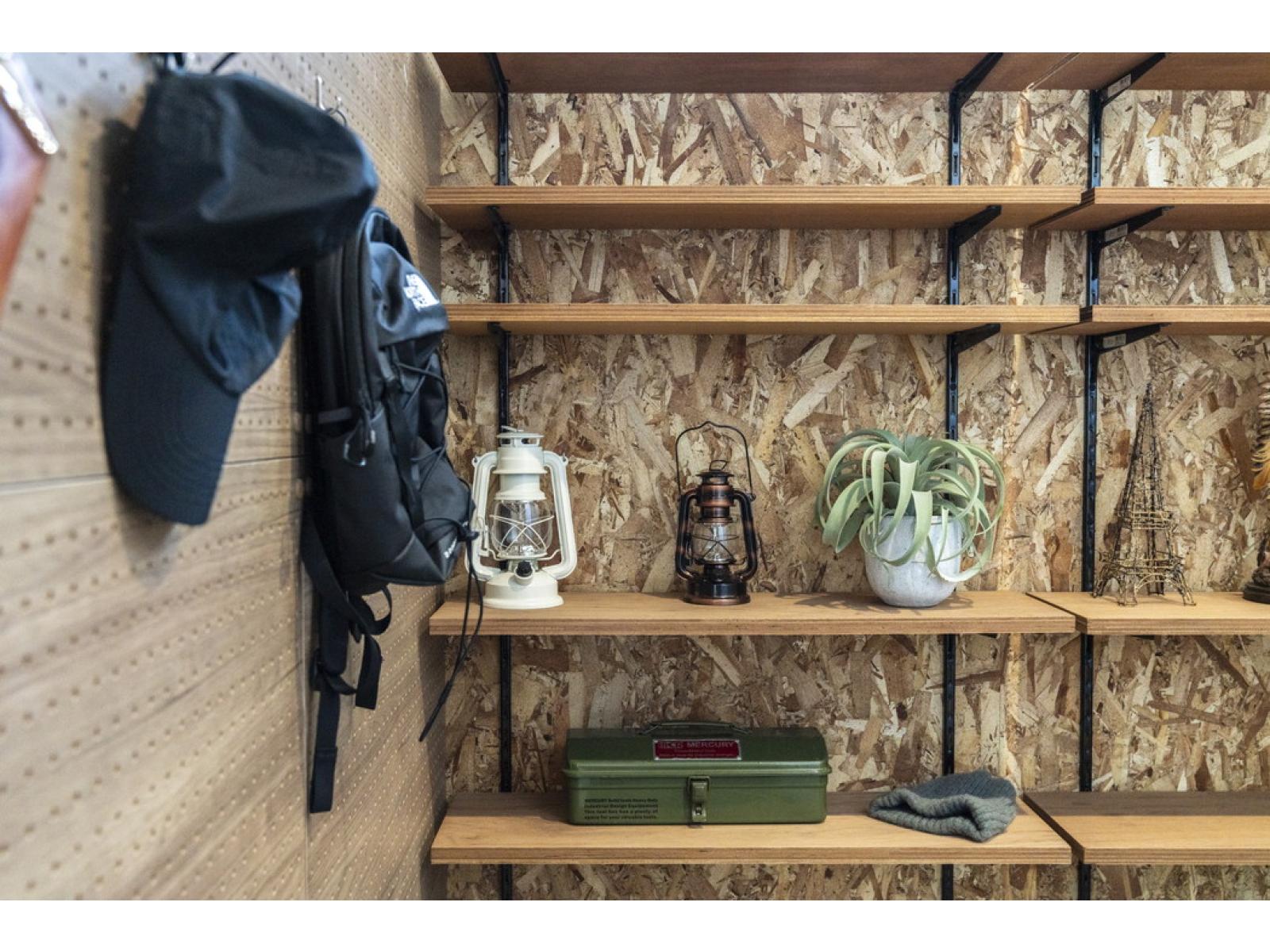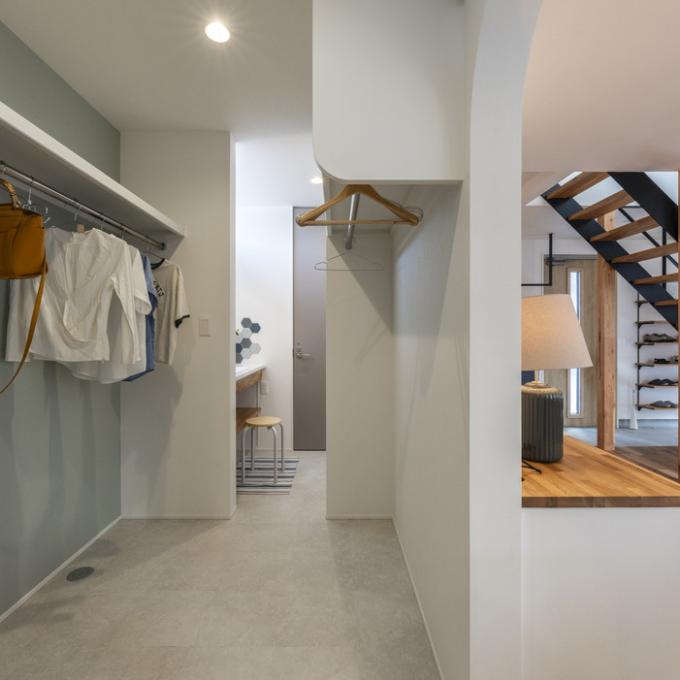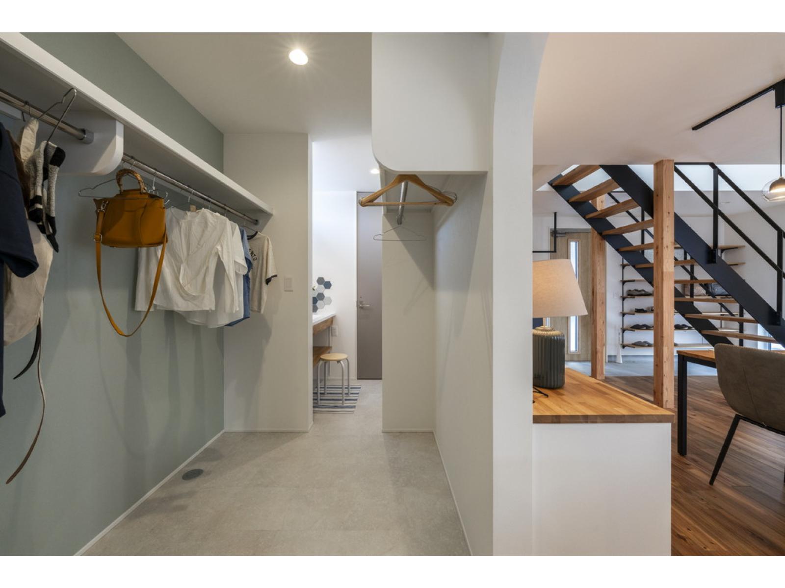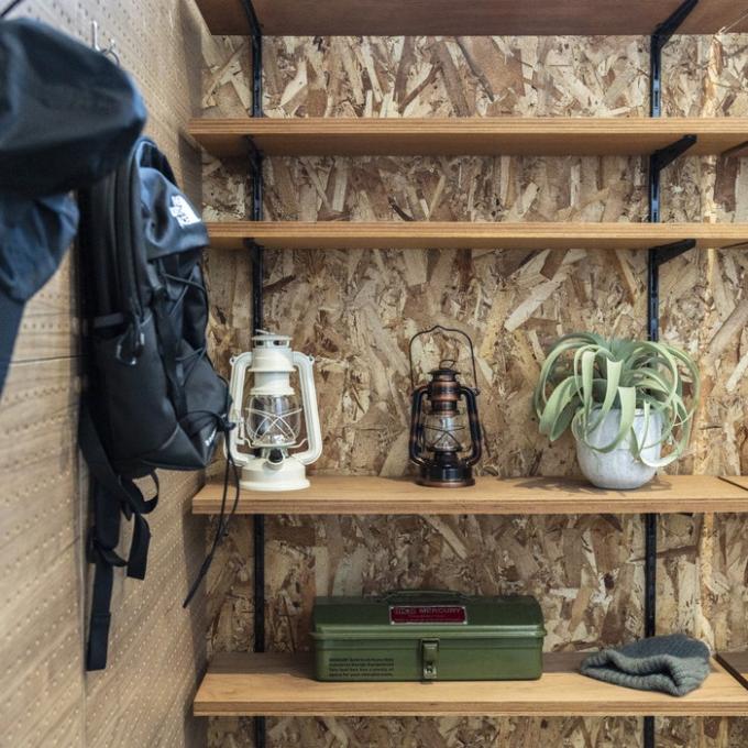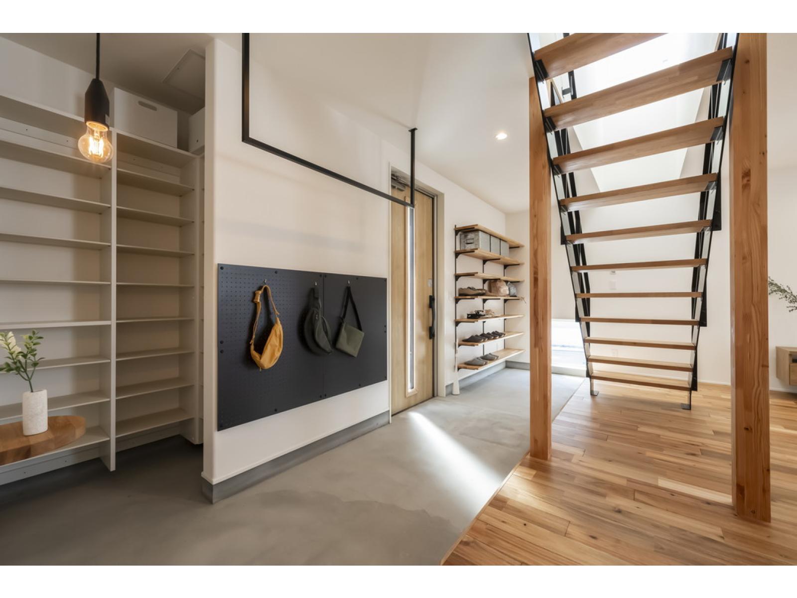 ライフステージによって変わる持ち物の量に対応するために、各所にざっくりとした収納スペースを用意。玄関には土間に沿ったオープン棚。