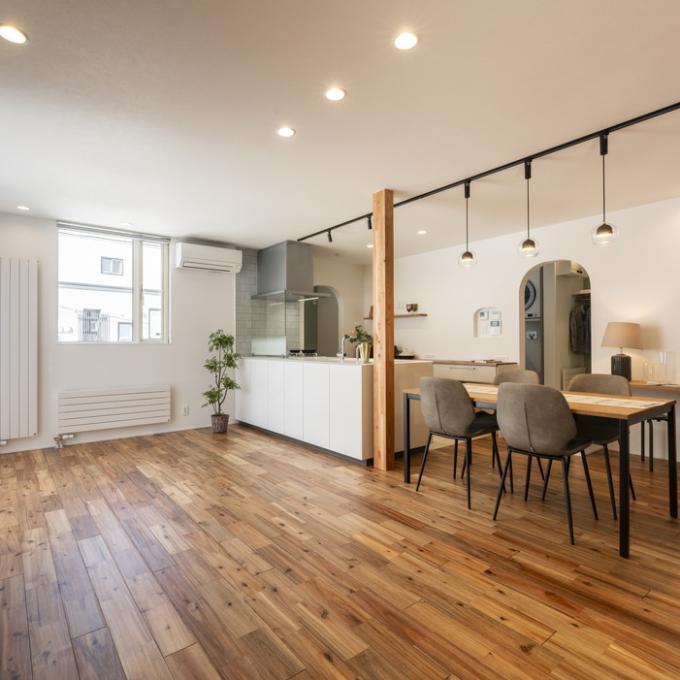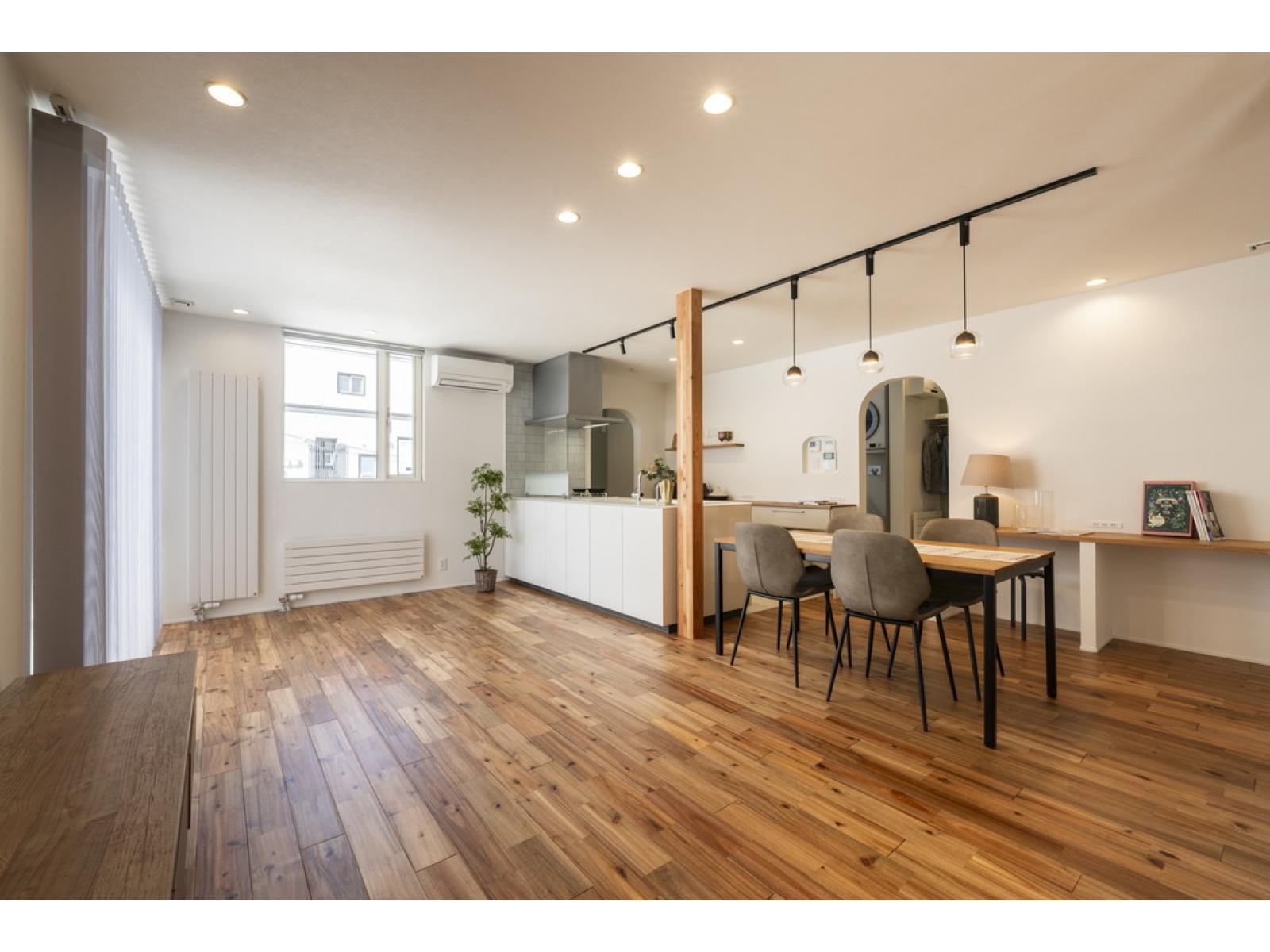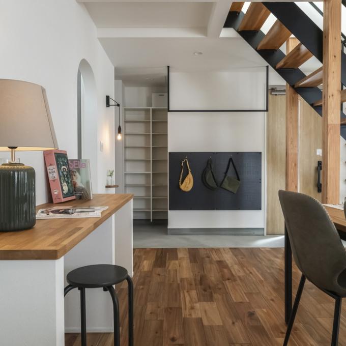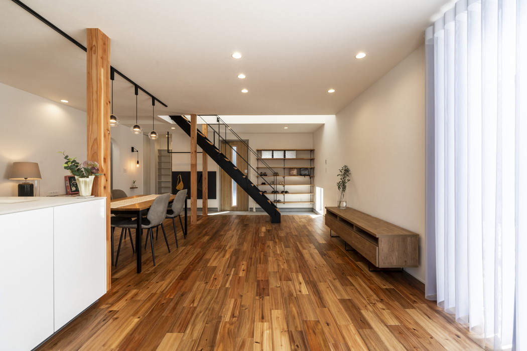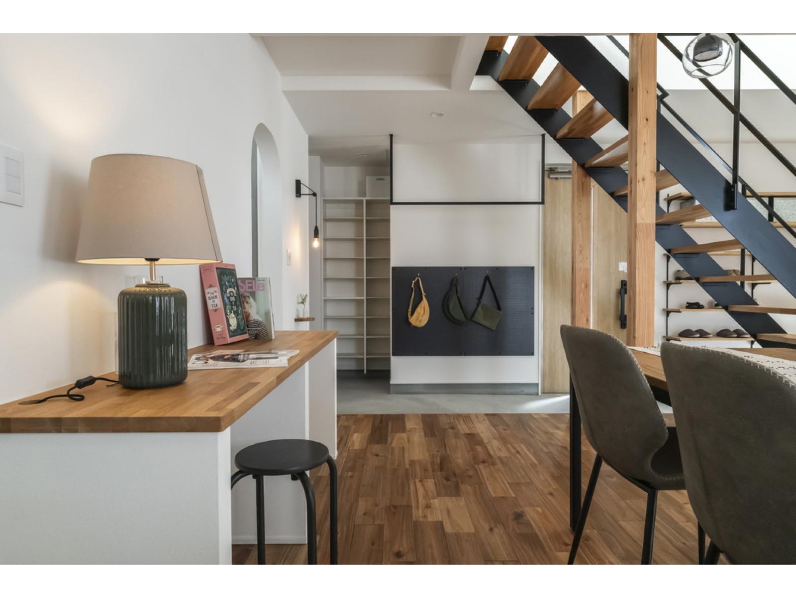 広々としたLDKをご希望されていたので、玄関土間と一体になった大空間を提案。玄関を開けると階段が程よい目隠しになりながらも開放感を感じられる空間を実現。