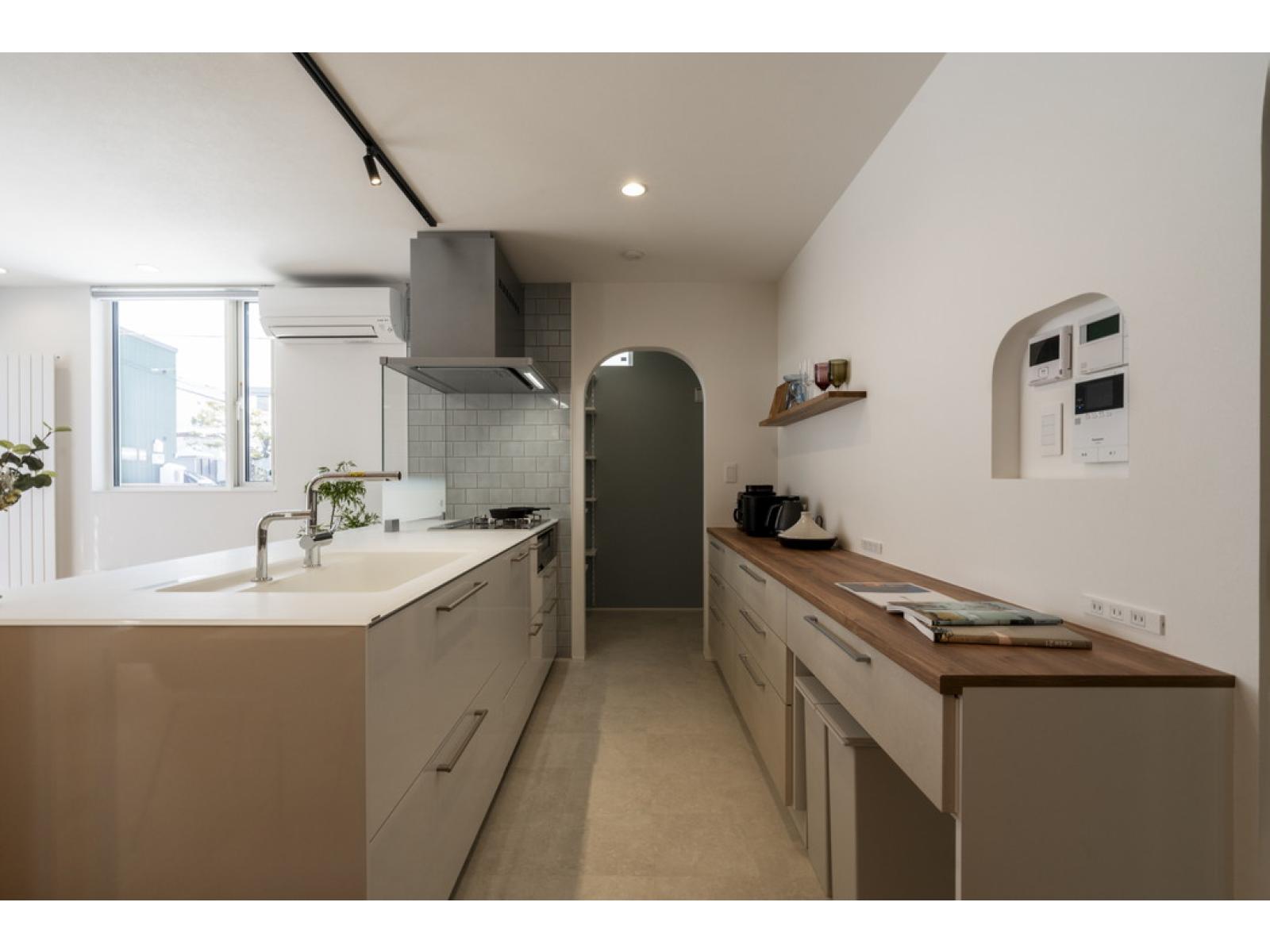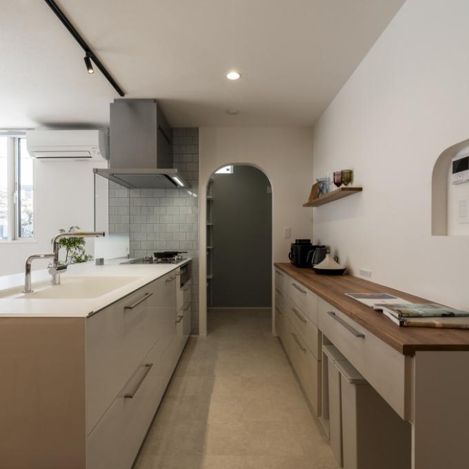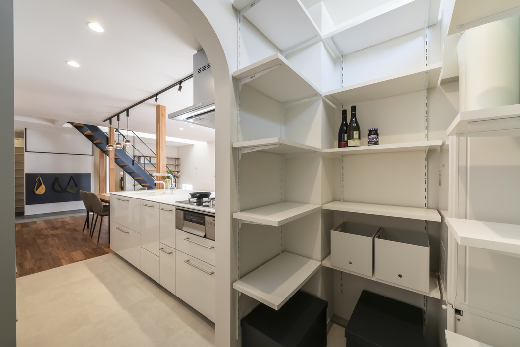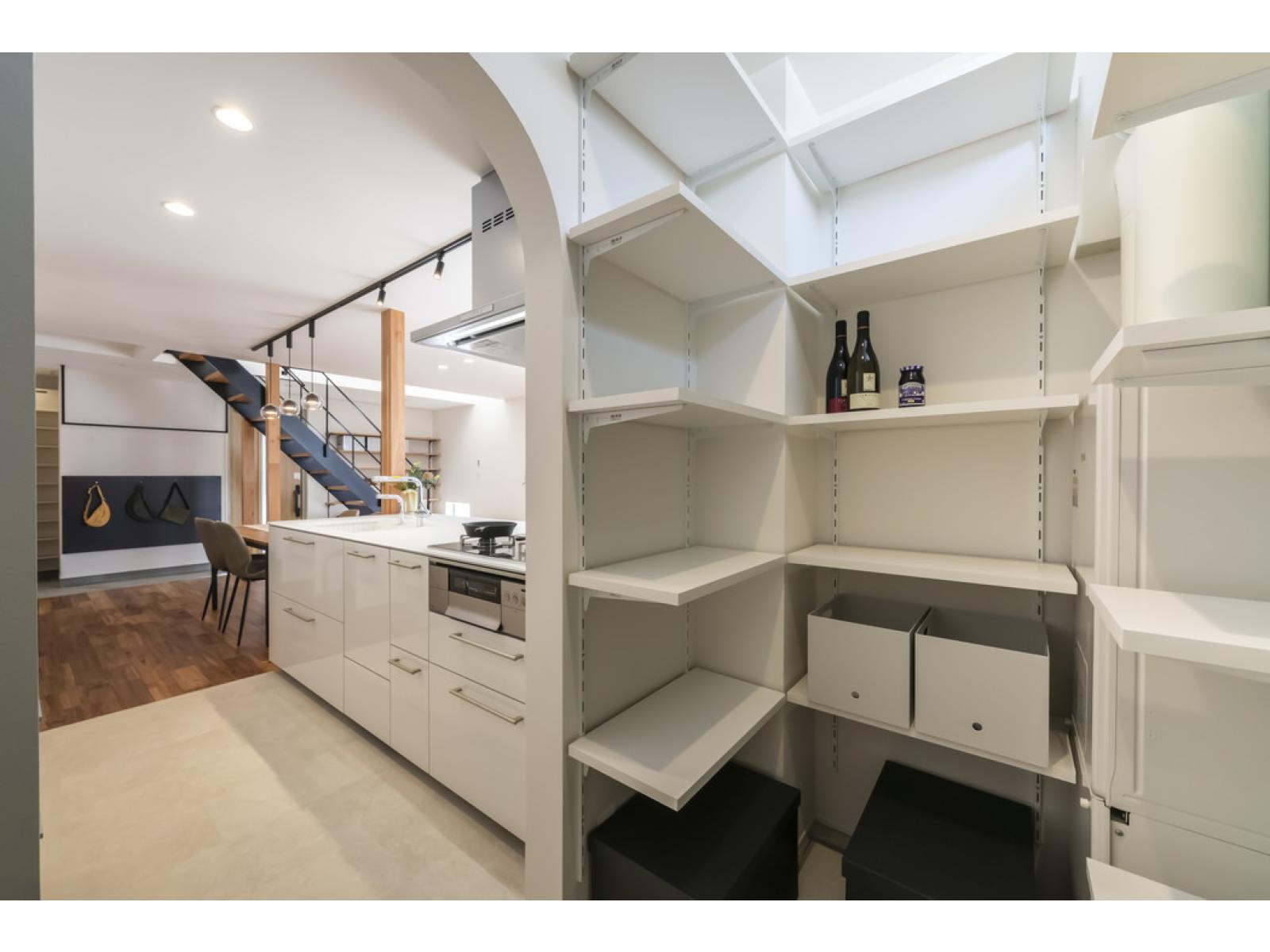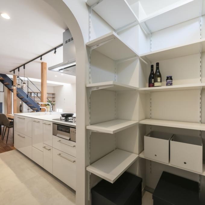 キッチン奥にはざっくりとしまえるパントリー。2Fには通り抜けのファミリークローゼット。