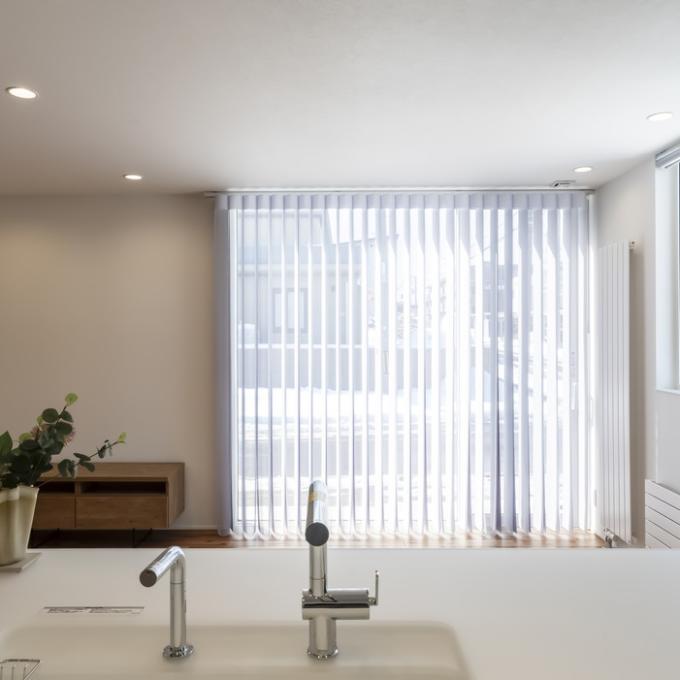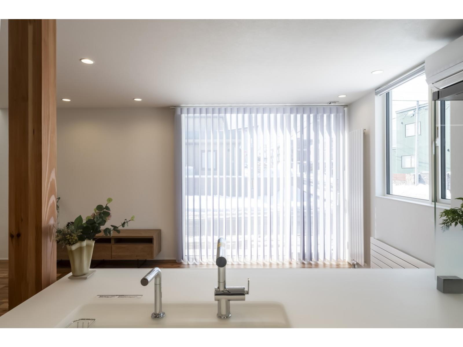 リビングの奥からは窓の外の植栽へと視線が広がるように設えています。